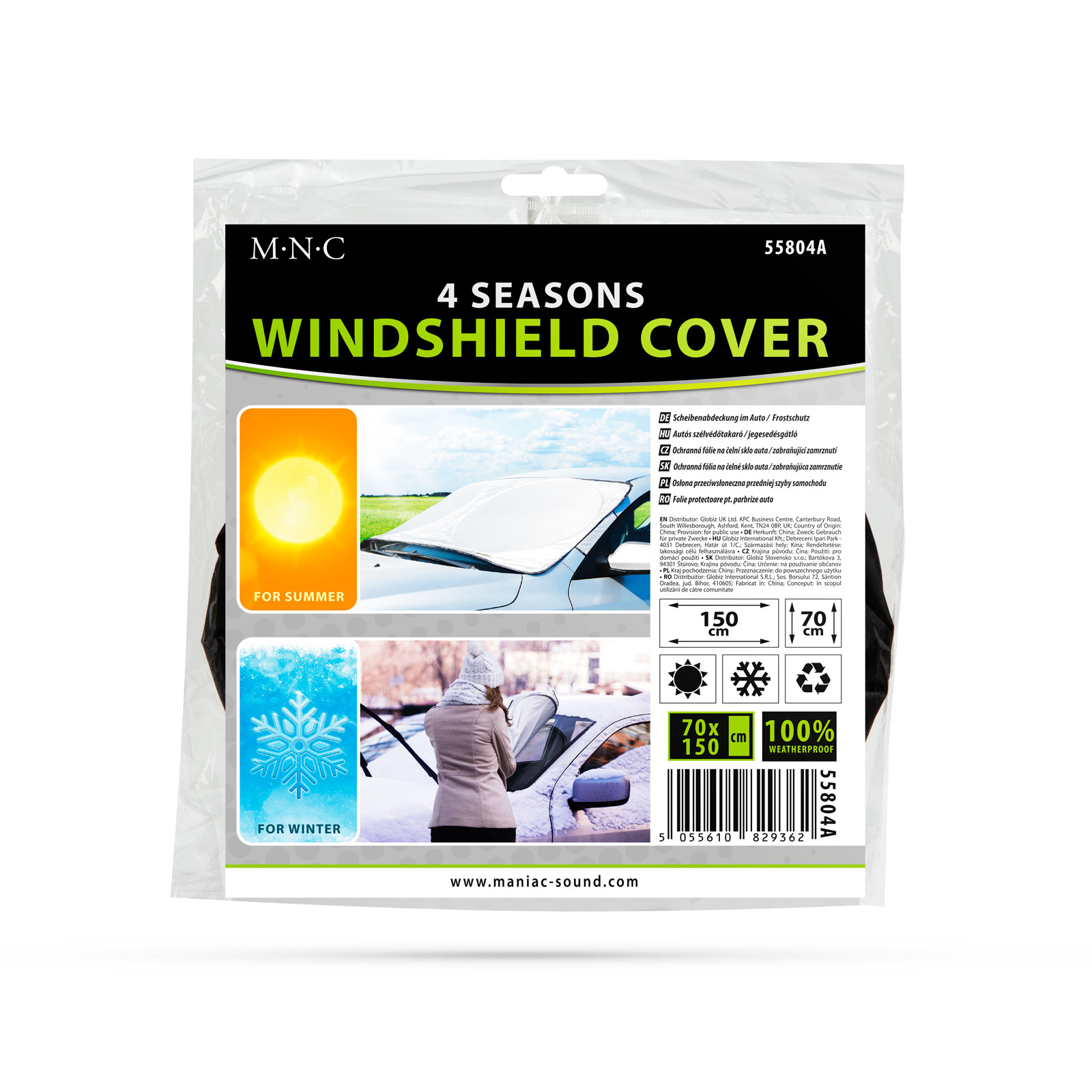 Praktikus téli-nyári kiegészítő autójához. Ennek a szélvédőtakarónak köszönhetően megakadályozhatja a szélvédő jegesedését, valamint könnyen eltávolítható a hóréteg is a szélvédőről. A hosszított kivitelnek köszönhetően könnyen rögzítheti az ajtóknál. A merev kör betét megfelelő tartást biztosít a hóréteg eltávolításakor. Ugyanakkor használható a nyári forróság ellen is, a tapadókorongokkal könnyen rögzíthető az autó belső terében is.