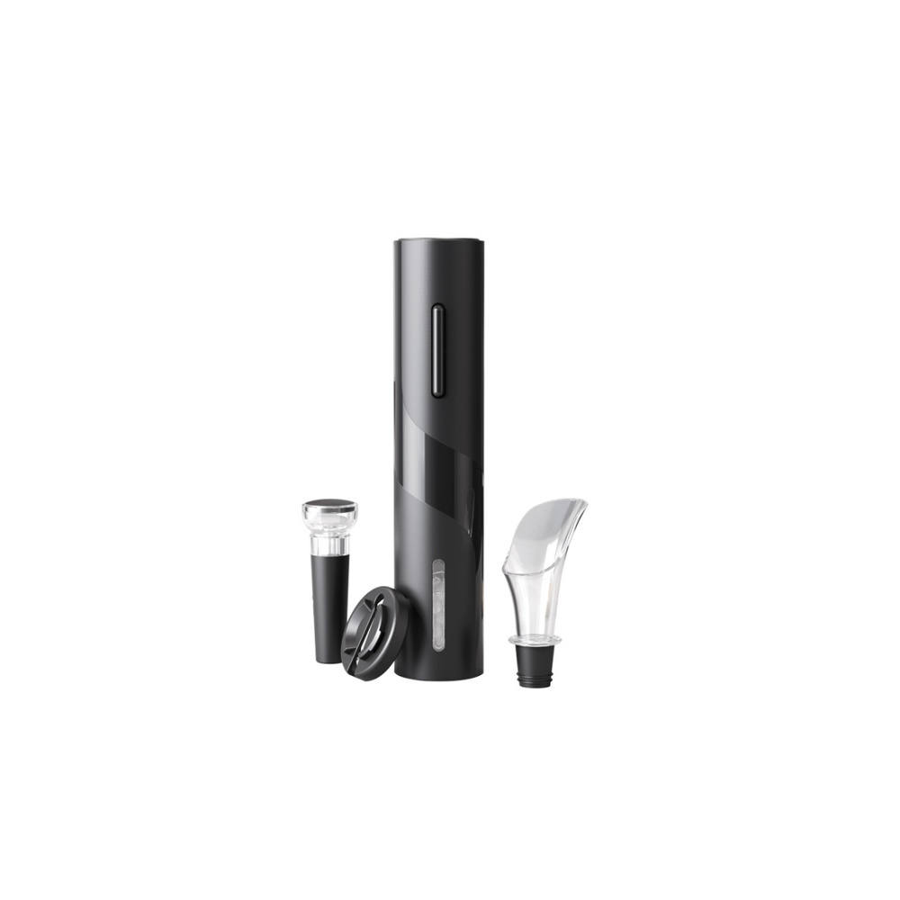 A négy darabos készletben a 4 db AA ceruzaelemmel működő elektromos dugóhúzó mellett találjuk a fólia eltávolítását megkönnyítő eszközt, a megbontott bor tárolásához elengedhetetlenül szükséges dugót, és az üveg nyakához csatlakoztatható kiöntőt is.